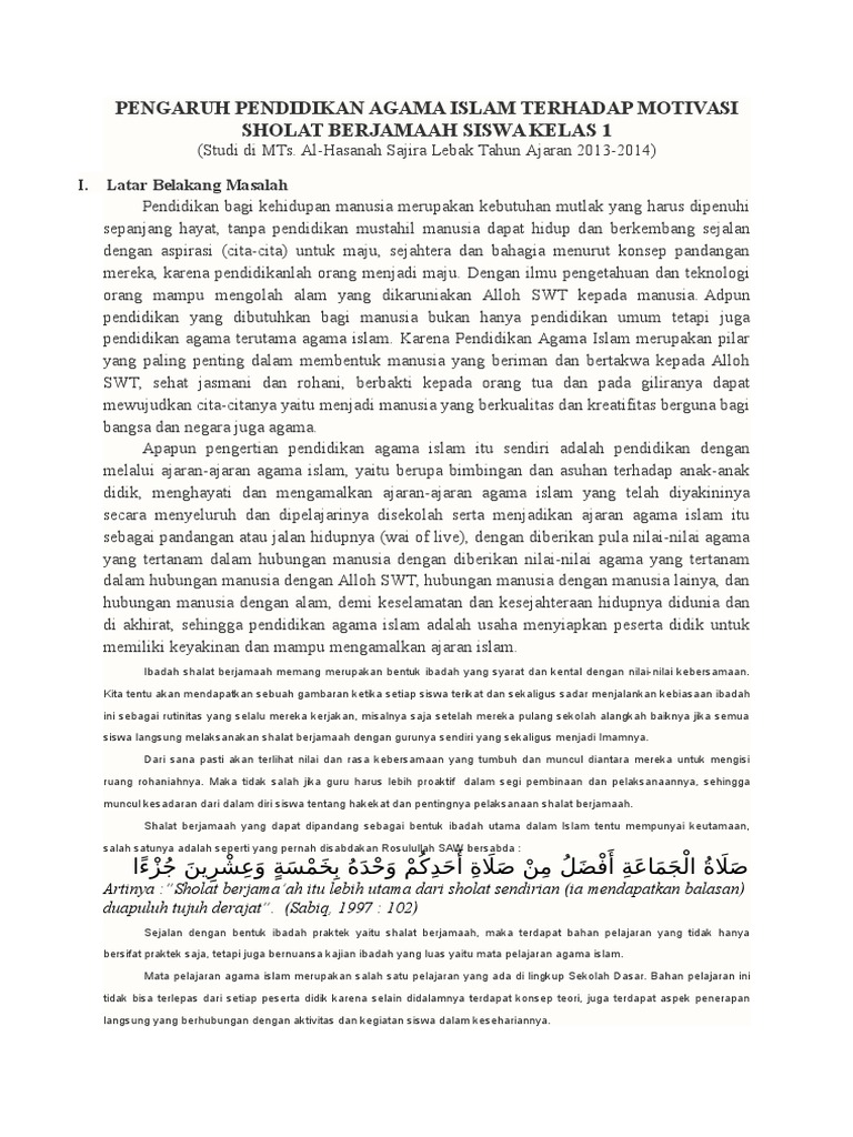 Tidak dibedakan antara yang kaya dan yang miskin, seorang pejabat atau rakyat jelata, atasan atau bawahan, semua berdiri, ruku', sujud, dan duduk dalam satu barisan untuk taat dan tunduk kepada allah. Mendapat jaminan surga dan keberuntungan orang beriman pastinya ingin mendapatkan jaminan surga dari allah. Melalui shalat berjamaah akan diperoleh taufik untuk berdo'a secara berjamaah. Hal ini sebagaimana tersebut di dalam hadits nabi shallallahu 'alaihi wa sallam: Bersegera untuk shalat di awal waktu. Sangat sedikit yang membiasakan sholat lima waktunya berjamaah di masjid atau musholla di mana azan dikumandangkan. Rasulullah memerintahkan kita untuk senantiasa berjama'ah: A short summary of this paper. 26 full pdfs related to this paper. Sebaiknya jamaah dilakukan di masjid, meskipun jauh. Diantara keutamaan atau manfaat dari sholat berjamaah adalah sebagai berikut : Dari shalat berjamaah diperoleh pencerahan fikiran dalam upaya bersama untuk kemenangan islam dan penyebaran. Sedemikian lengkapnya sehingga soal bagaimana melaksanakan sholat berjamaahpun diatur di dalamnya.